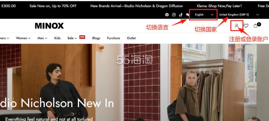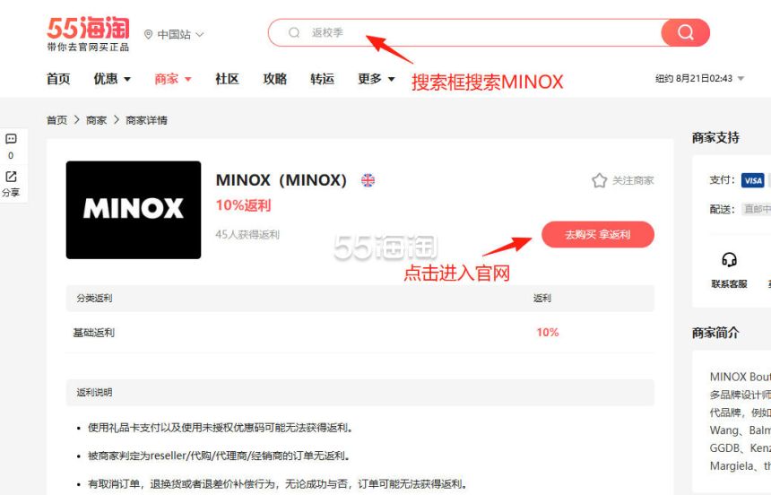 1. 注册并登录55海淘账号,不仅可以关注到国内外购物网站的优惠折扣,购物还能享受返利。本次教程以55海淘网页版为例。首先,在搜索栏搜索MINOX,点击“去购买拿返利”进入MINOX英国官网。