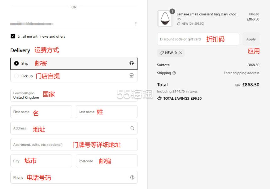 7. 首先来填写邮寄地址,网站支持直邮中国,可填写国内地址,转运需要参考转运公司提供的地址,有折扣码可以添加折扣码使用。