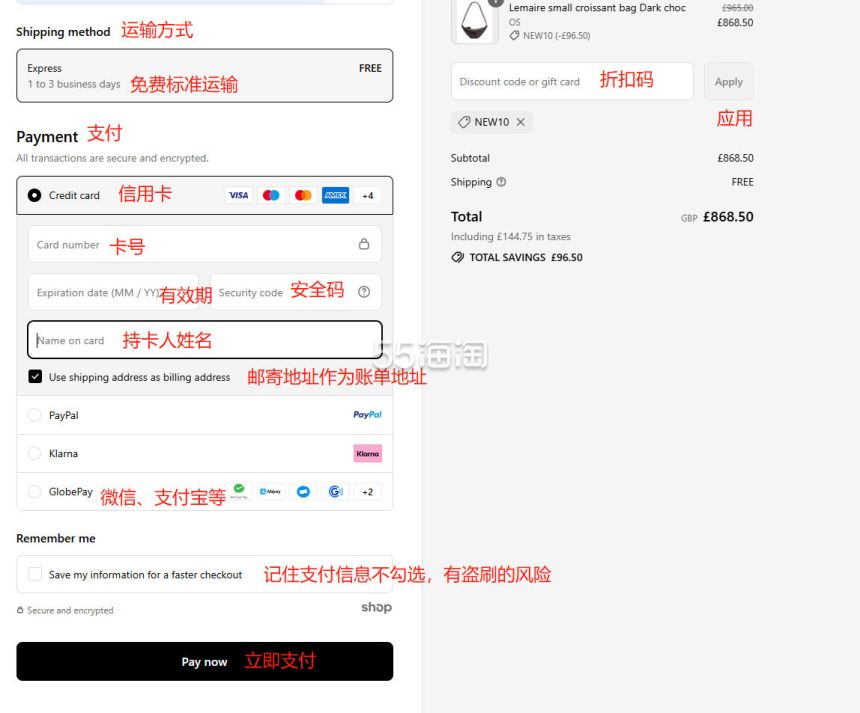 8. 邮寄方式默认免费邮寄,最后填写支付信息,选择信用卡支付的话,根据提示填写好信用卡信息,记住不要勾选保存支付信息的选项,有卡被盗刷的风险。账单地址可勾选和邮寄地址相同,最后点击“Pay now”提交订单完成支付后,订单就生成啦。