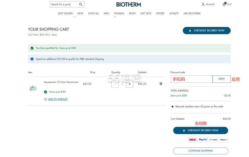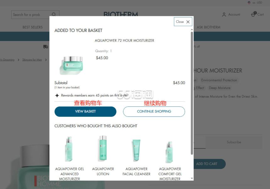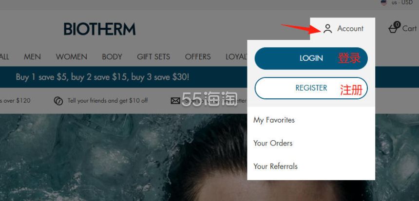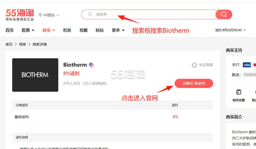 1. 注册并登录55海淘账号,不仅可以关注到国内外购物网站的优惠折扣,购物还能享受返利。本次教程以55海淘网页版为例。首先,在搜索栏搜索Biotherm,点击“去购买拿返利”进入Biotherm美国官网。