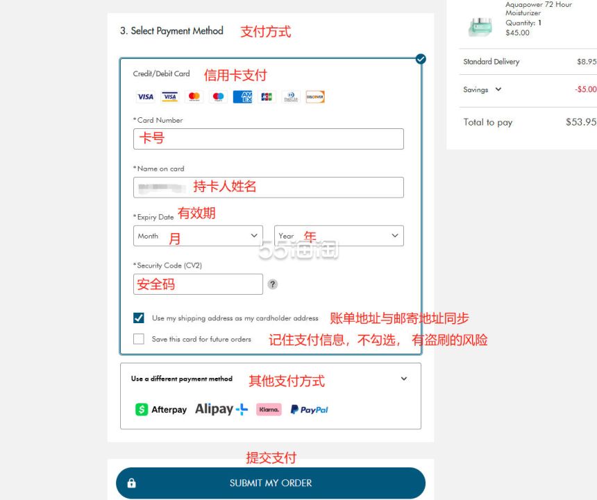 9. 最后填写支付信息,选择信用卡支付的话,根据提示填写好信用卡信息,记住不要勾选保存支付信息的选项,有卡被盗刷的风险。账单地址可勾选和邮寄地址相同,最后点击“SUBMIT MY ORDER”提交订单完成支付后,订单就生成啦。