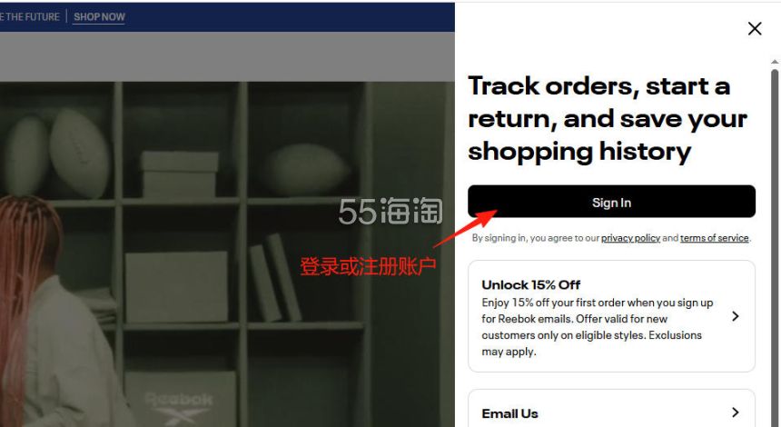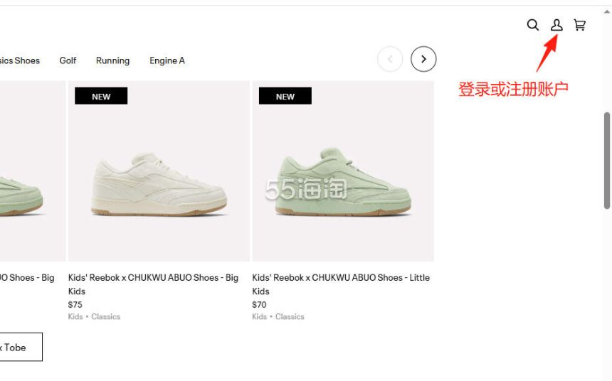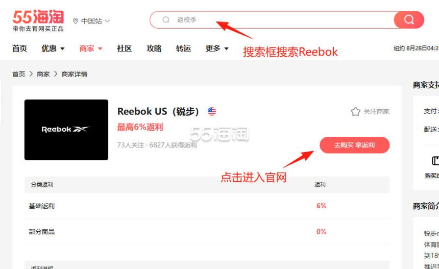 1. 注册并登录55海淘账号,不仅可以关注到国内外购物网站的优惠折扣,购物还能享受返利。本次教程以55海淘网页版为例。首先,在搜索栏搜索Reebok US,点击“去购买拿返利”进入Reebok美国官网。