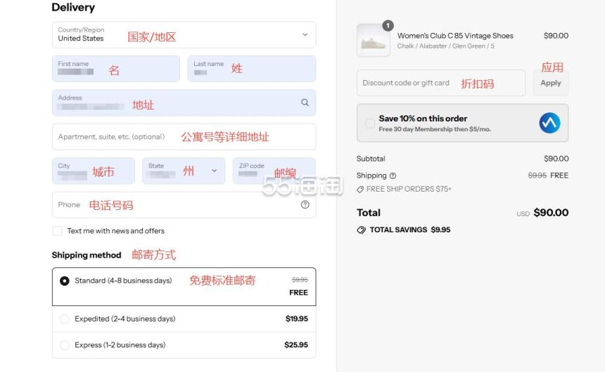 8. 首先来填写邮寄地址,网站不支持直邮中国,所以地址填写需要参考转运公司的地址,有折扣码可以添加折扣码使用,邮寄方式选择第一个标准方式邮寄。