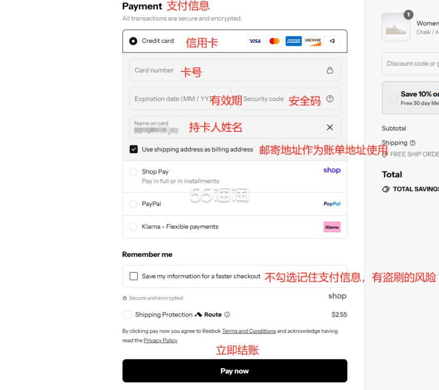 9. 最后填写支付信息,选择信用卡支付的话,根据提示填写好信用卡信息,记住不要勾选保存支付信息的选项,有卡被盗刷的风险。账单地址可勾选和邮寄地址相同,最后点击“Pay now”提交订单完成支付后,订单就生成啦。