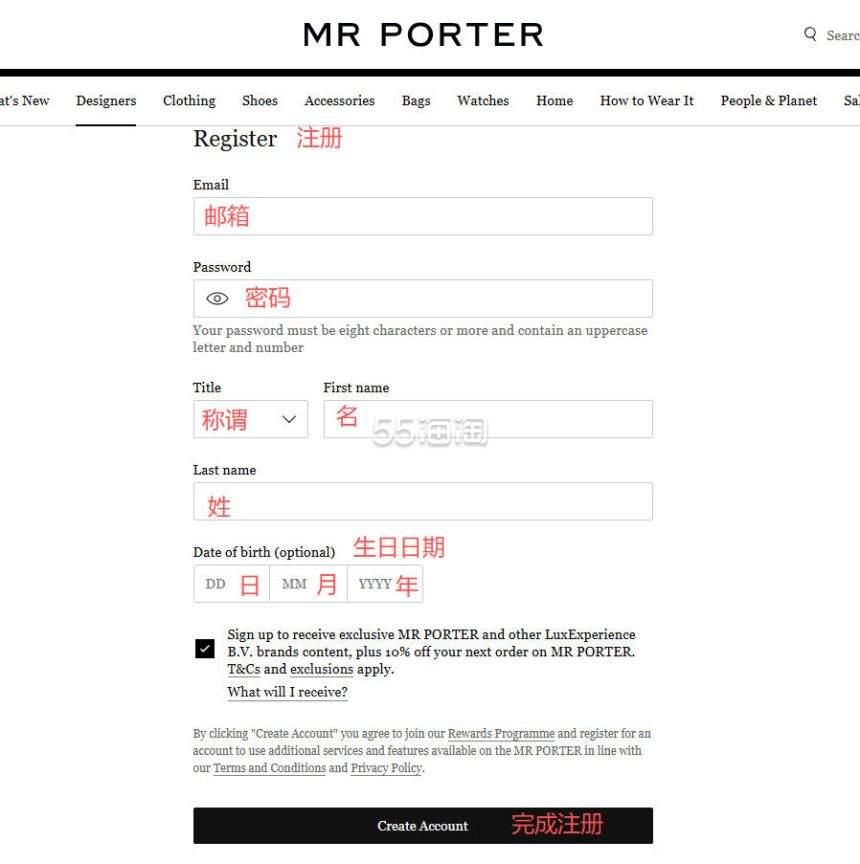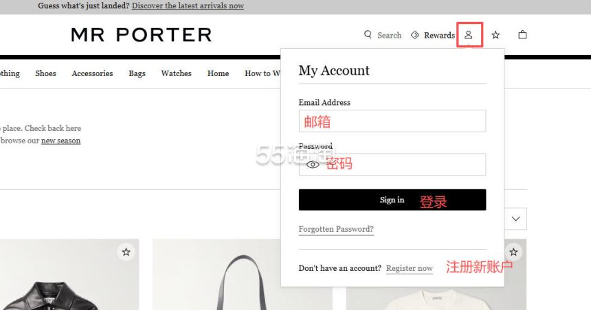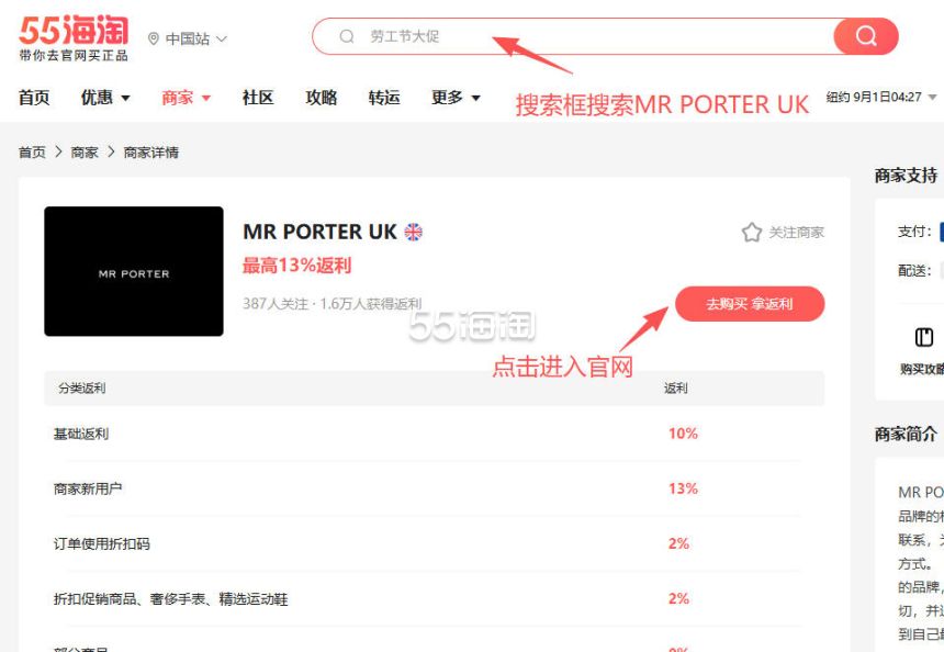 1. 注册并登录55海淘账号,不仅可以关注到国内外购物网站的优惠折扣,购物还能享受返利。本次教程以55海淘网页版为例。首先,在搜索栏搜索MR PORTER英国官网,点击“去购买拿返利”进入MR PORTER英国官网。