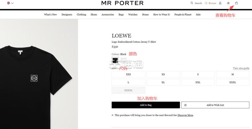 4. 账号注册好之后就可以开始购物啦,选择你想买的产品,进入到详情页,选择好尺码、颜色之后,点击“Add to bag”将产品加入购物车,右上角购物袋可查看加入的商品。
