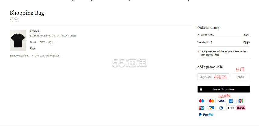 6. 进入购物车内,有折扣码可填写折扣码享受优惠,确认好购物车的商品就可以去结账啦,点击“proceed to purchase”进入结账流程。