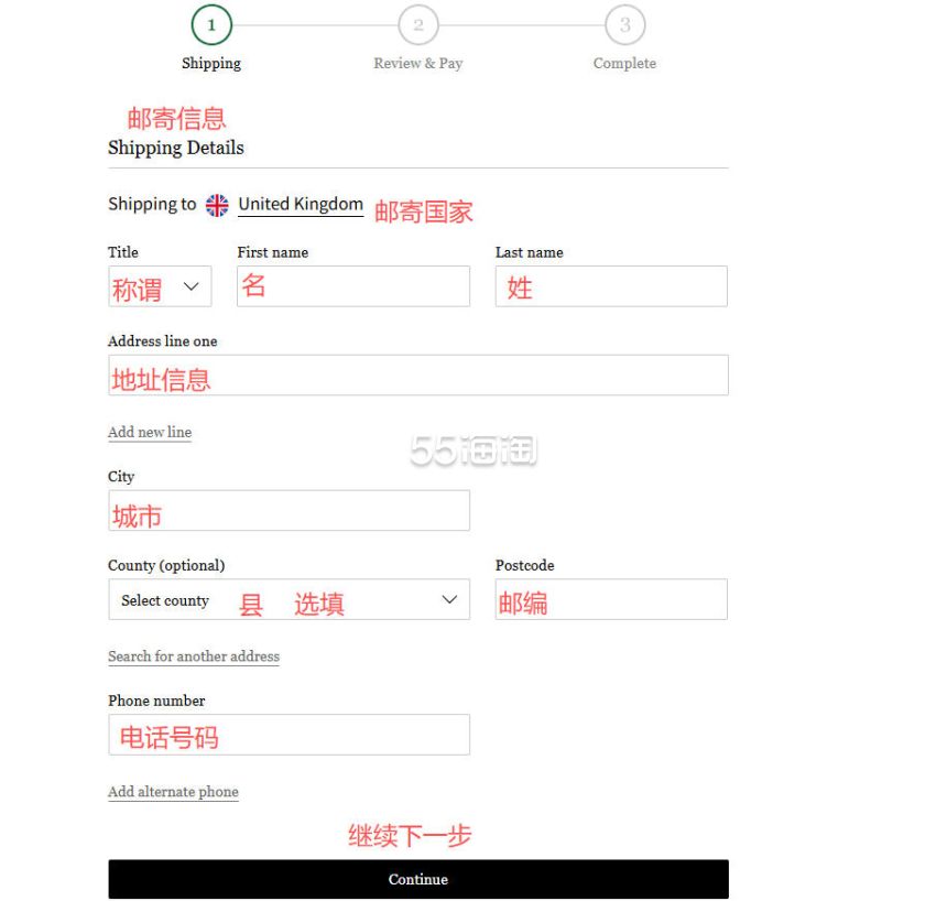 7. 首先来填写邮寄地址,网站不支持直邮中国,所以地址填写需要参考转运公司的地址,点击“continue”进入下一步。