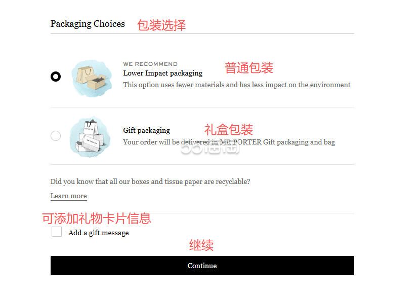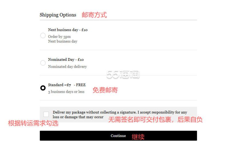8. 接下来选择邮寄方式,一般选择免费邮寄,签收方式可咨询下转运公司,是否需要当面签收,选择好之后点击“continue”选择包裹包装,如果需要礼物包装和卡片,可勾选,选好之后点击“continue”进入下一步。