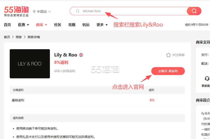 1. 注册并登录55海淘账号,不仅可以关注到国内外购物网站的优惠折扣,购物还能享受返利。本次教程以55海淘网页版为例。首先,在搜索栏搜索Lily & Roo,点击“去购买拿返利”进入Lily & Roo英国官网。