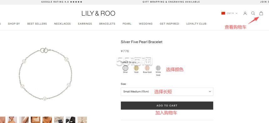 4. 账号登录好之后就可以开始购物啦,选择你想买的产品,进入到详情页,选择好尺码、颜色之后,点击“ADD TO CART”将产品加入购物车,右上角购物袋可查看购物车。