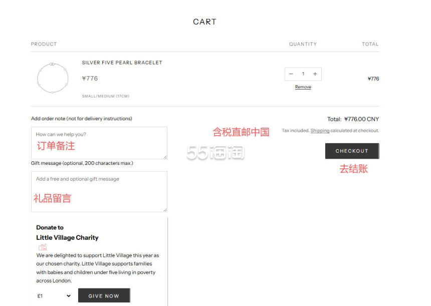 6. 现在来到购物车中,确认好购物车的商品就可以去结账啦,点击“CHECKOUT”进入结账流程。