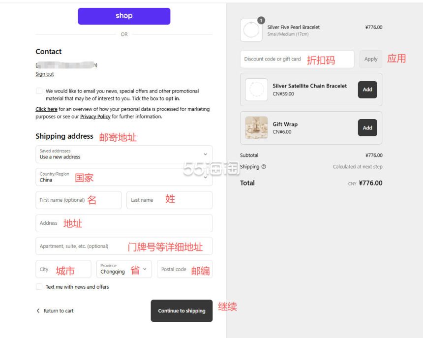 7. 首先来填写邮寄地址,网站支持直邮中国,所以地址填写中国地址拼音,有折扣码可以添加折扣码使用,点击“Continue to shipping”进入下一步。