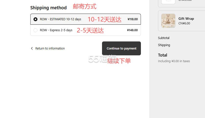 8. 接下来选择邮寄方式,一般不着急就选便宜的运输方式,,点击“Continue to payment”继续结账。