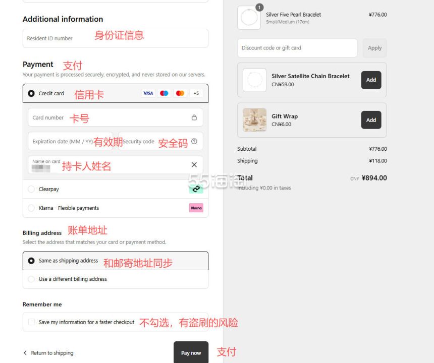 9. 最后填写支付信息,选择信用卡支付的话,根据提示填写好信用卡信息,记住不要勾选保存支付信息的选项,有卡被盗刷的风险。账单地址可勾选和邮寄地址相同,最后点击“Pay now”提交订单完成支付后,订单就生成啦。