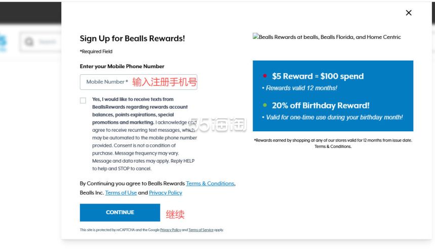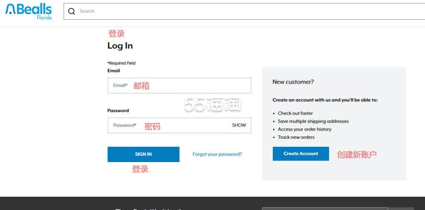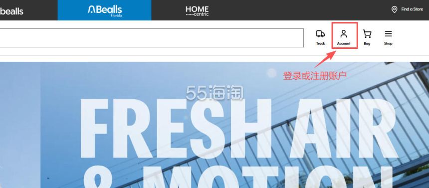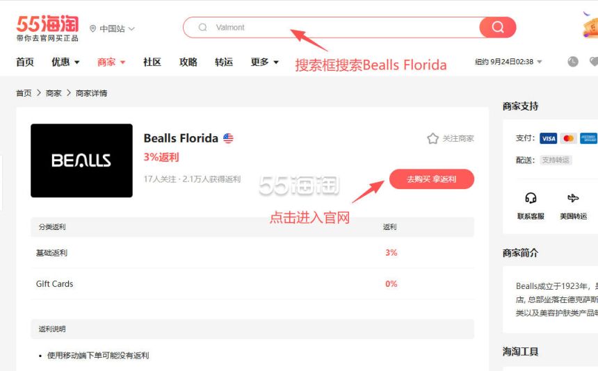 1. 注册并登录55海淘账号,不仅可以关注到国内外购物网站的优惠折扣,购物还能享受返利。本次教程以55海淘网页版为例。首先,在搜索栏搜索Bealls Florida,点击“去购买拿返利”进入Bealls Florida美国官网。