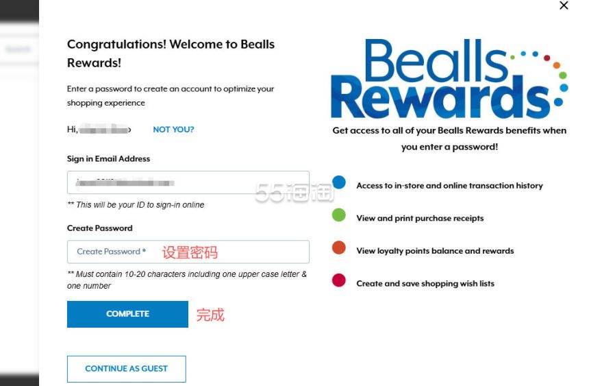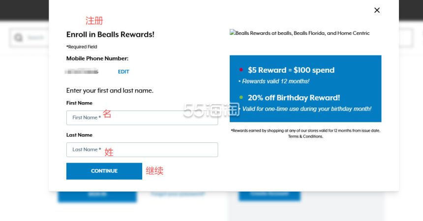 4. 现在来到创建账户的页面,首先输入手机号,点击“CONTINUE”继续下一步。接下来填写姓名,点击“CONTINUE”继续下一步。最后根据提示填写账号信息,设置好密码,填写好之后点击“COMPLETE”完成账号创建。