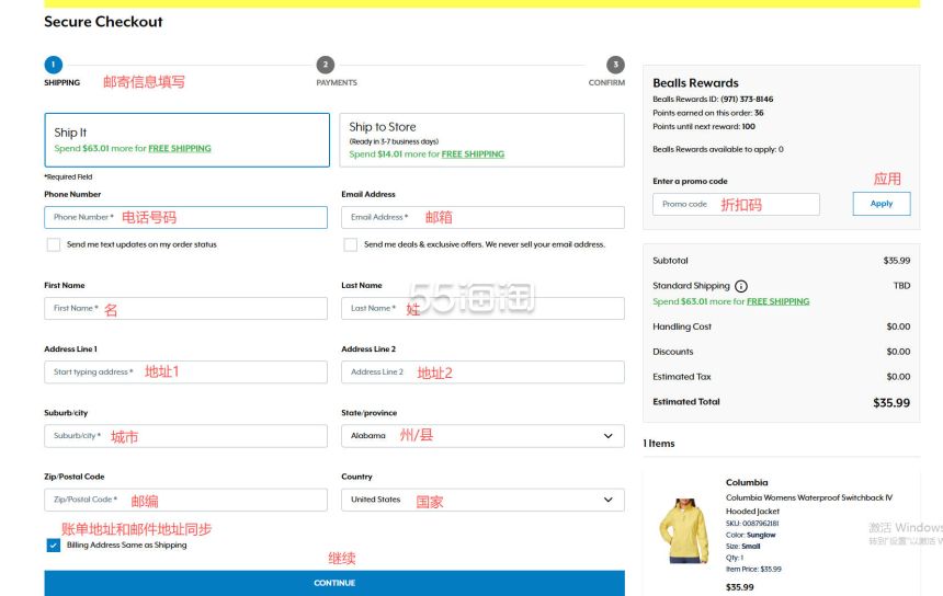 7. 首先来填写邮寄地址,网站不支持直邮中国,所以地址填写需要参考转运公司的地址,有折扣码可以添加折扣码使用,账单地址可勾选和邮寄地址相同,填写之后点击“CONTINUE”进行下一步。
