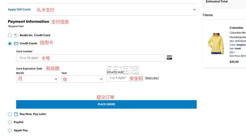 8. 最后填写支付信息,选择信用卡支付的话,根据提示填写好信用卡信息,最后点击“PLACE ORDER”提交订单完成支付后,订单就生成啦。