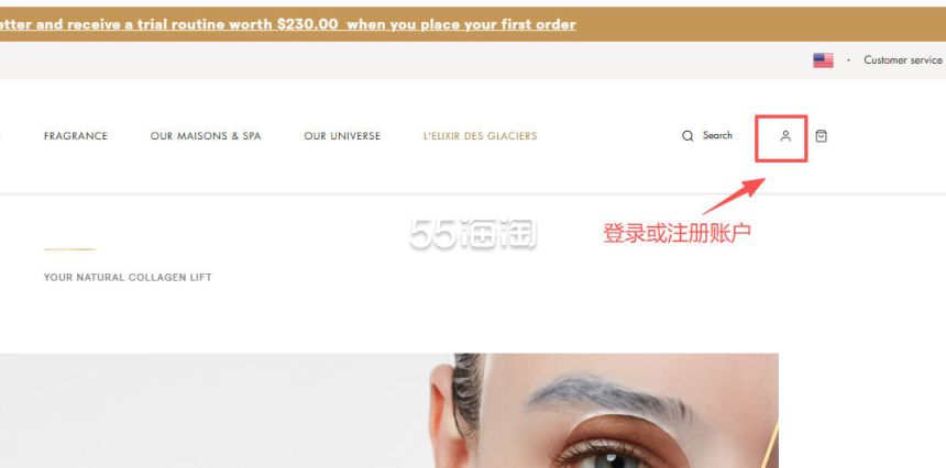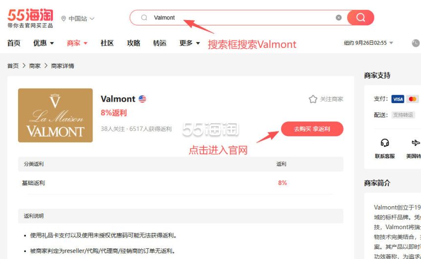 1. 注册并登录55海淘账号,不仅可以关注到国内外购物网站的优惠折扣,购物还能享受返利。本次教程以55海淘网页版为例。首先,在搜索栏搜索Valmont,点击“去购买拿返利”进入Valmont美国官网。
