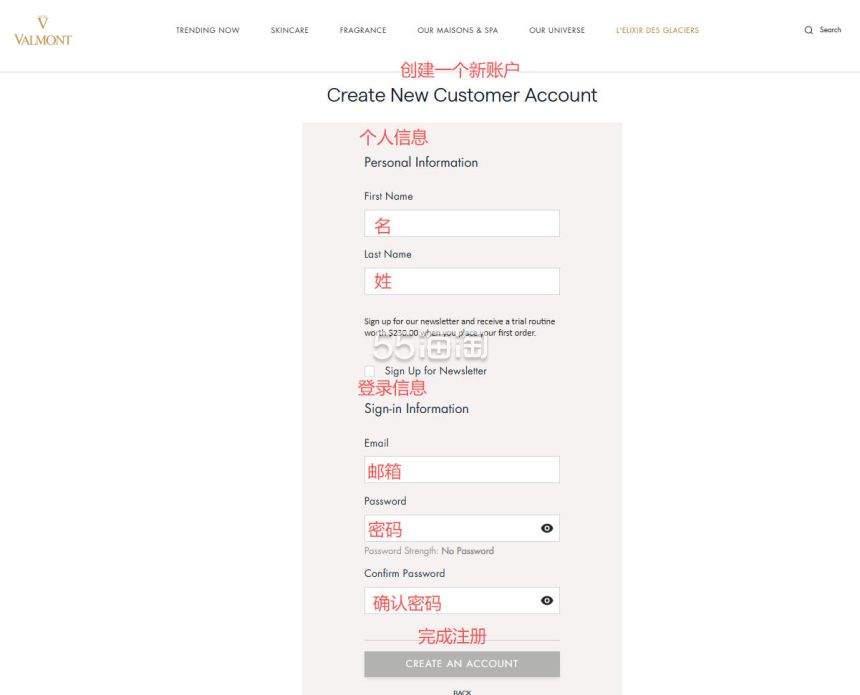 4. 现在来到创建账户的页面,根据提示填写账号信息,填写好之后点击“CREATE AN ACCOUNT”完成账号创建。