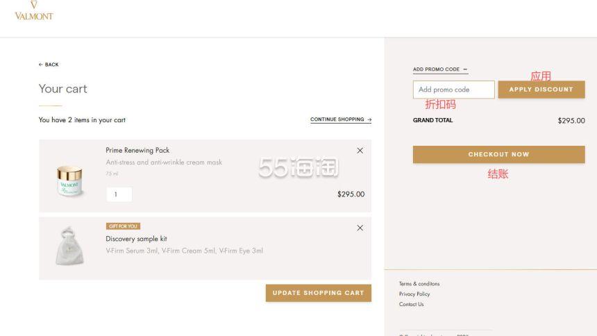 7. 确认好购物车的商品就可以去结账啦,有折扣码可填写折扣码享受优惠。点击“CHECKOUT NOW”进入结账流程。
