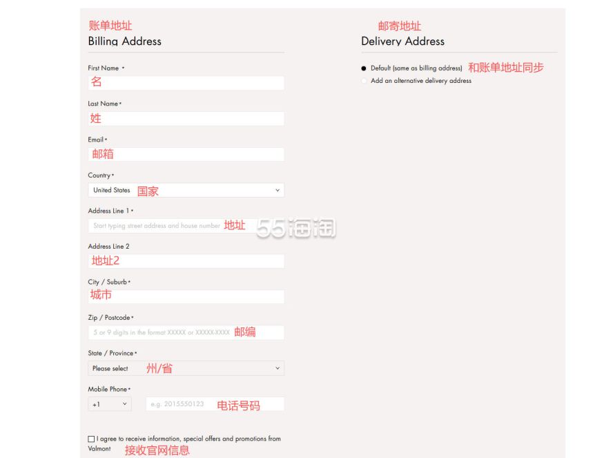 8. 首先来填写账单地址,网站不支持直邮中国,所以地址填写需要参考转运公司的地址。邮寄地址可填写于账单地址同步,也可添加一个新的邮寄地址。