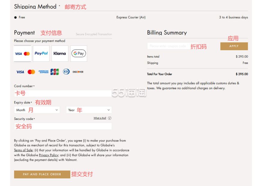 9.最后填写支付信息,选择信用卡支付的话,根据提示填写好信用卡信息,有折扣码可填写折扣码享受优惠。最后点击“PAY AND PLACE ORDER”提交订单完成支付后,订单就生成啦。