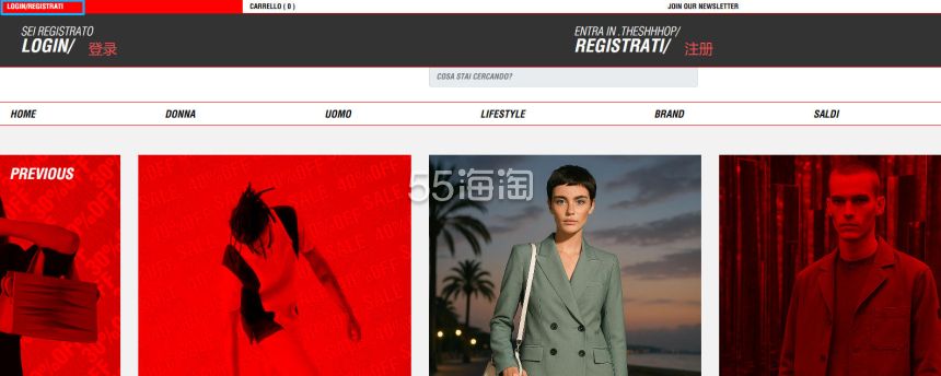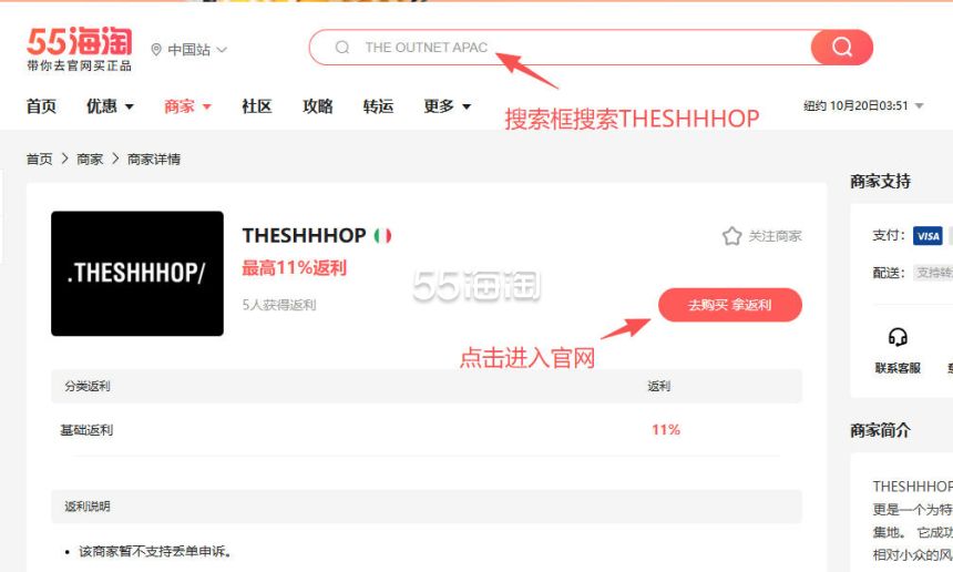 1. 注册并登录55海淘账号,不仅可以关注到国内外购物网站的优惠折扣,购物还能享受返利。本次教程以55海淘网页版为例。首先,在搜索栏搜索THESHHHOP,点击“去购买拿返利”进入THESHHHOP意大利官网。