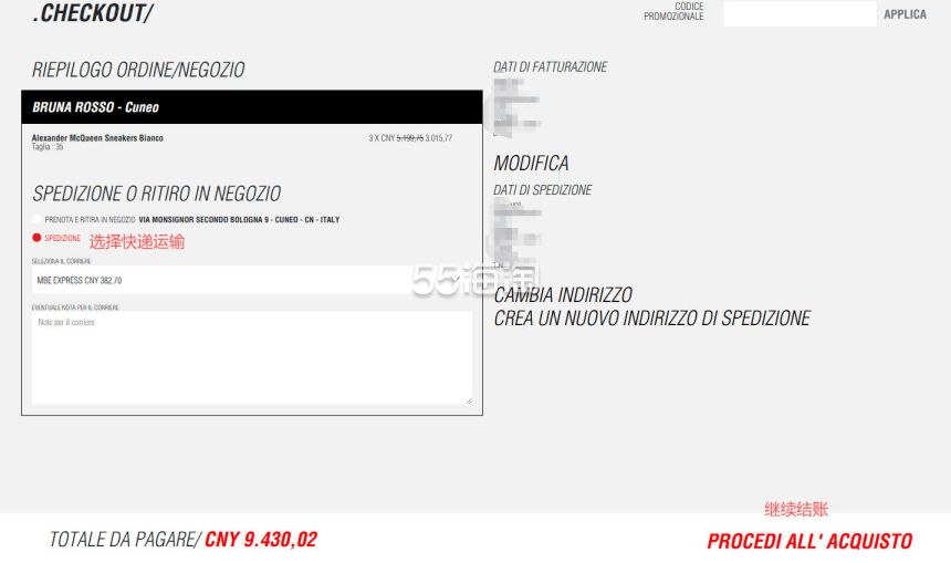 6. 选择快递运输,注册账号是填写过地址,无需再填写,点击“PROCEDI”继续结账。