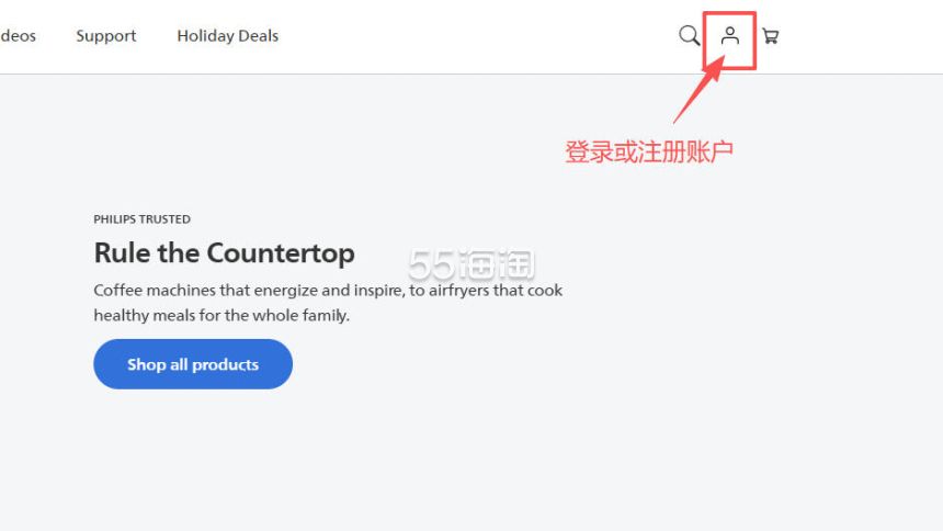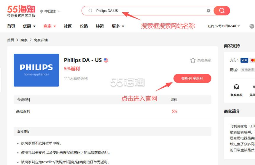 1. 注册并登录55海淘账号,不仅可以关注到国内外购物网站的优惠折扣,购物还能享受返利。本次教程以55海淘网页版为例。首先,在搜索栏搜索Philips家电美国官网,点击“去购买拿返利”进入Philips家电美国官网。