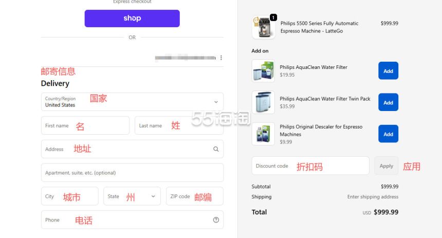 7. 首先来填写邮寄地址,网站不支持直邮中国,所以地址填写需要参考转运公司的地址,有折扣码可以添加折扣码使用。