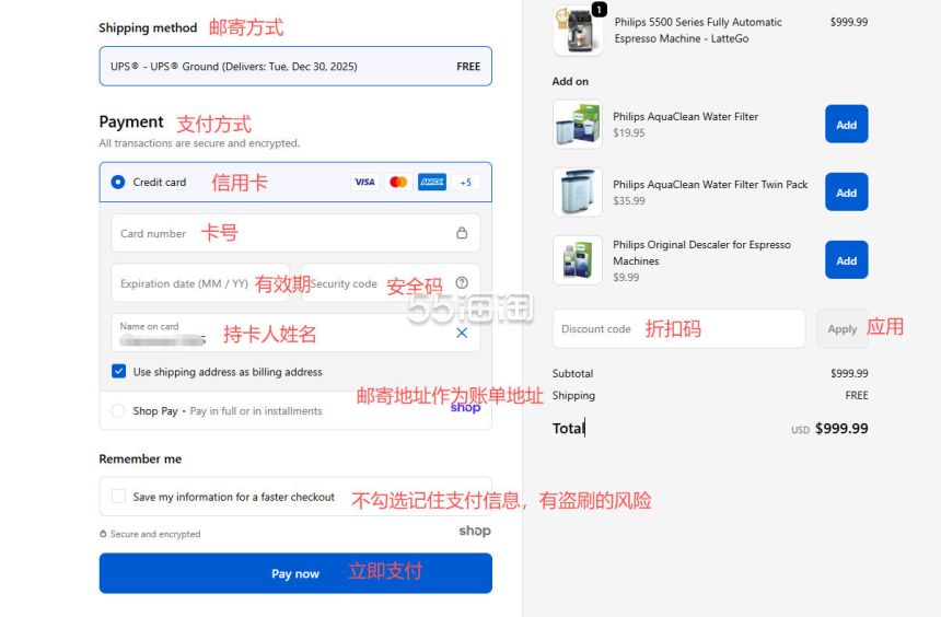 8. 邮寄方式默认,最后填写支付信息,选择信用卡支付的话,根据提示填写好信用卡信息,记住不要勾选保存支付信息的选项,有卡被盗刷的风险。账单地址可勾选和邮寄地址相同,最后点击“Pay now”提交订单完成支付后,订单就生成啦。