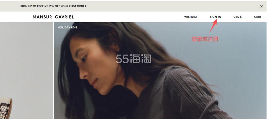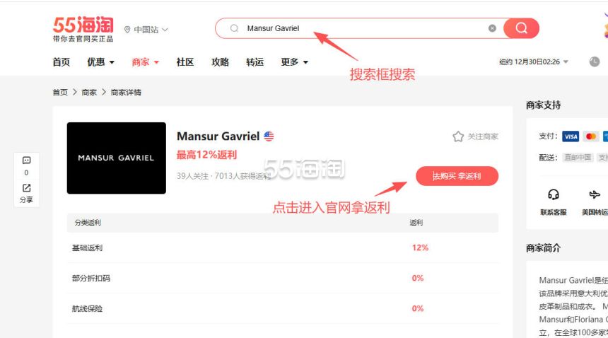 1. 注册并登录55海淘账号,不仅可以关注到国内外购物网站的优惠折扣,购物还能享受返利。本次教程以55海淘网页版为例。首先,在搜索栏搜索Mansur Gavriel,点击“去购买拿返利”进入Mansur Gavriel美国官网。