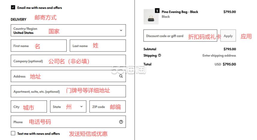 7. 首先来填写邮寄地址,网站支持直邮中国,可以填写中文地址拼音,也可以转运,地址参考转运公司的地址,有折扣码可以添加折扣码使用。