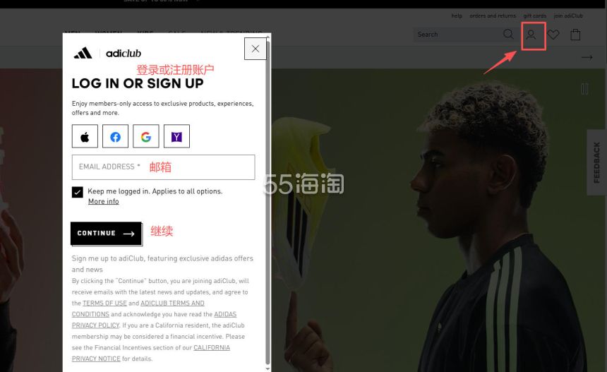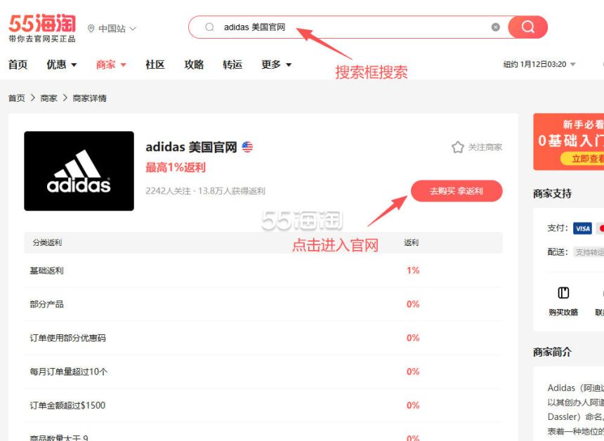 1. 注册并登录55海淘账号,不仅可以关注到国内外购物网站的优惠折扣,购物还能享受返利。本次教程以55海淘网页版为例。首先,在搜索栏搜索adidas 美国官网,点击“去购买拿返利”进入adidas 美国官网。