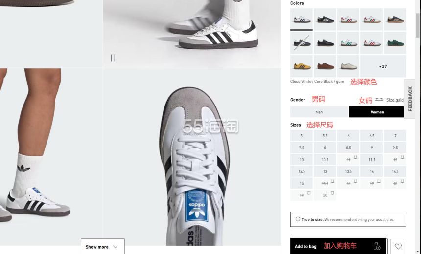 5. 账号注册好之后就可以开始购物啦,选择你想买的产品,进入到详情页,选择好尺码、颜色之后,点击“ADD TO BAG”将产品加入购物车。