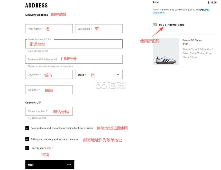 8. 首先来填写邮寄地址,网站不支持直邮中国,所以地址填写需要参考转运公司的地址,有折扣码可以添加折扣码使用,可账单地址可勾选和邮寄地址相同,点击“Next”进入下一步。