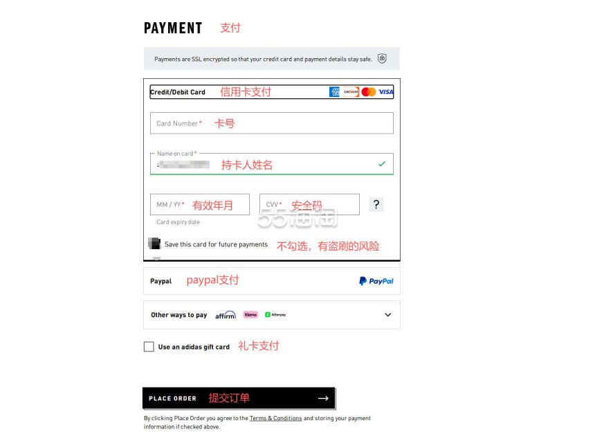 10. 最后填写支付信息,选择信用卡支付的话,根据提示填写好信用卡信息,记住不要勾选保存支付信息的选项,有卡被盗刷的风险。最后点击“PLACE ORDER”提交订单完成支付后,订单就生成啦。