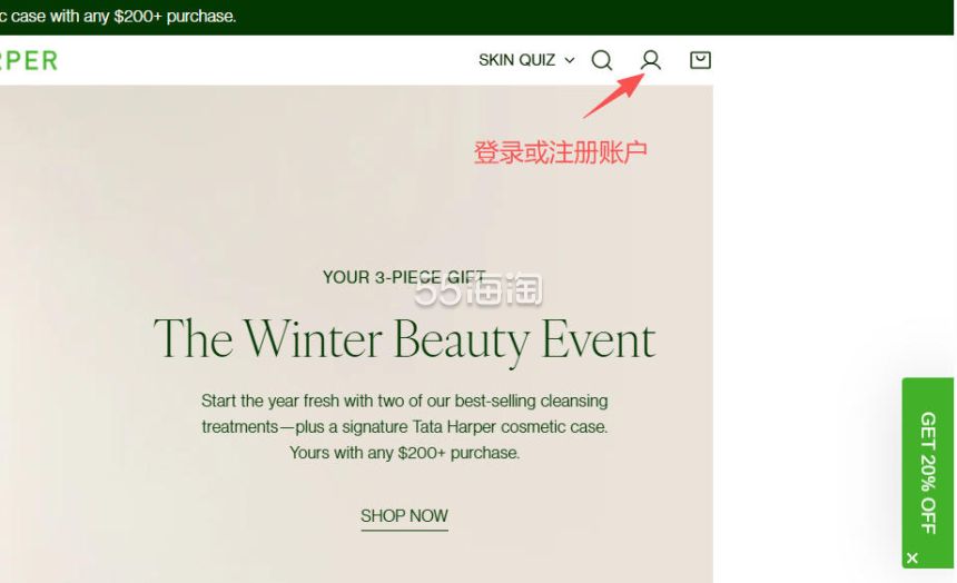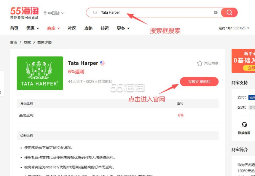 1. 注册并登录55海淘账号,不仅可以关注到国内外购物网站的优惠折扣,购物还能享受返利。本次教程以55海淘网页版为例。首先,在搜索栏搜索Tata Harper,点击“去购买拿返利”进入Tata Harper美国官网。