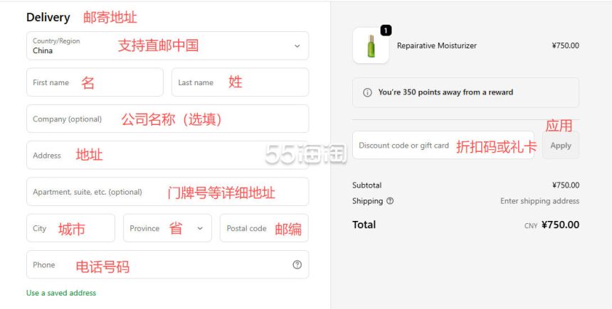 7. 首先来填写邮寄地址,网站支持直邮中国,可以填写中国地址的拼音,有折扣码可以添加折扣码使用。