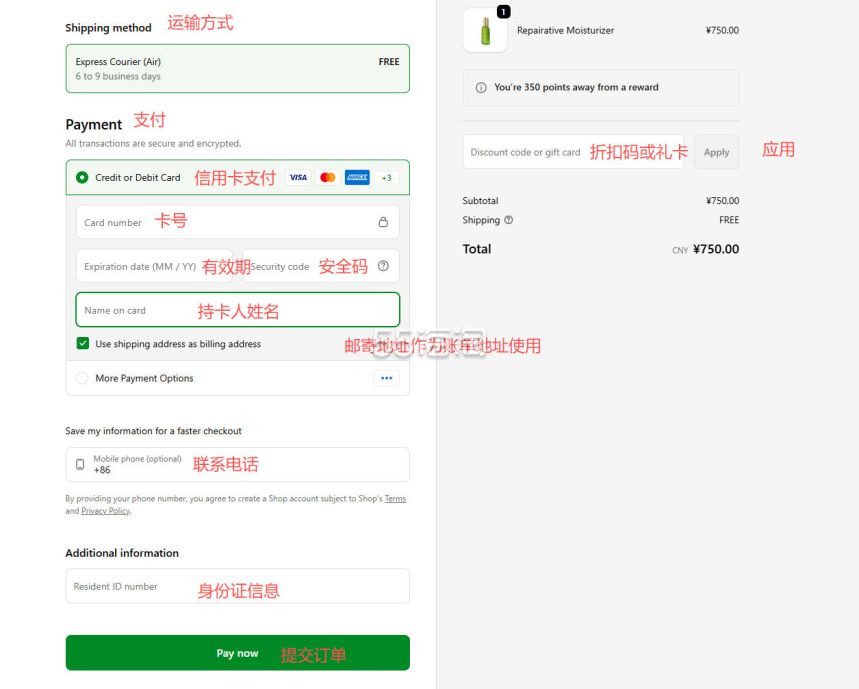 8. 支付方式默认,最后填写支付信息,选择信用卡支付的话,根据提示填写好信用卡信息,账单地址可勾选和邮寄地址相同,直邮中国需要身份证信息,根据提示填写,最后点击“Pay now”提交订单完成支付后,订单就生成啦。