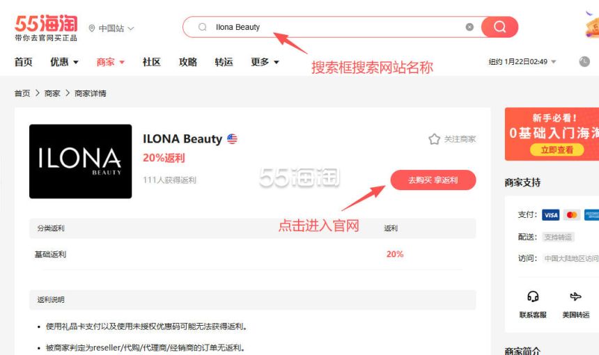1.注册并登录55海淘账号,不仅可以关注到国内外购物网站的优惠折扣,购物还能享受返利。本次教程以55海淘网页版为例。首先,在搜索栏搜索Ilona Beauty,点击“去购买拿返利”进入Ilona Beauty美国官网。