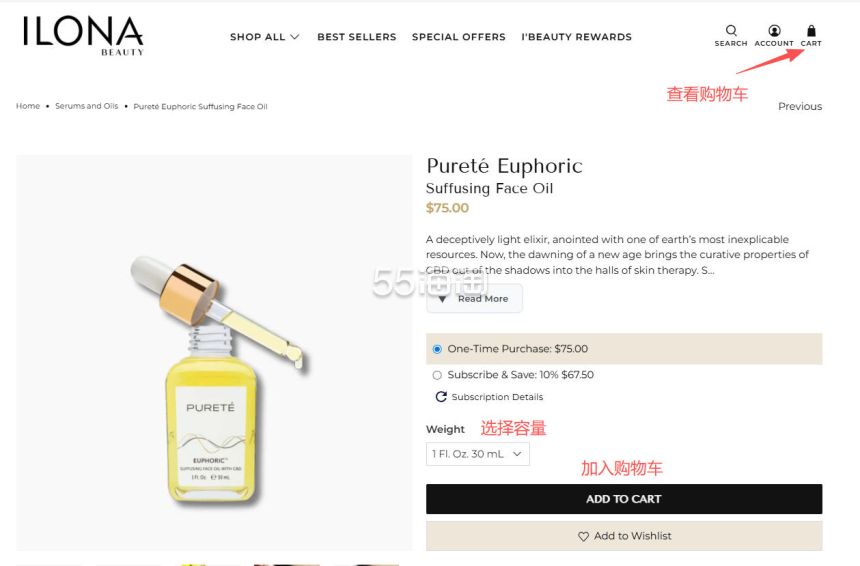 4.账号注册好之后就可以开始购物啦,选择你想买的产品,进入到详情页,选择好容量之后,点击“ADD TO CART”将产品加入购物车,5.可点击页面右上角的购物袋可直接进入购物车。