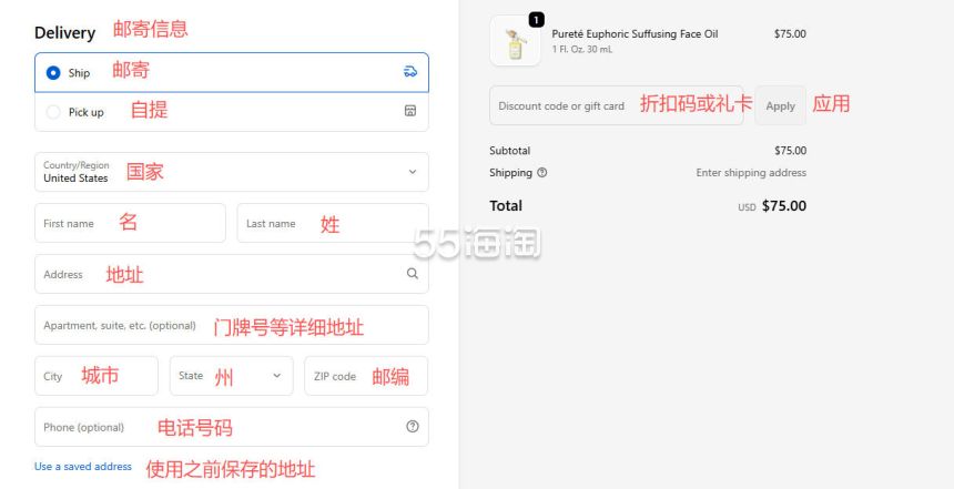 6.首先来填写邮寄地址,网站支持直邮中国,可以填写中国地址的拼音,有折扣码可以添加折扣码使用。