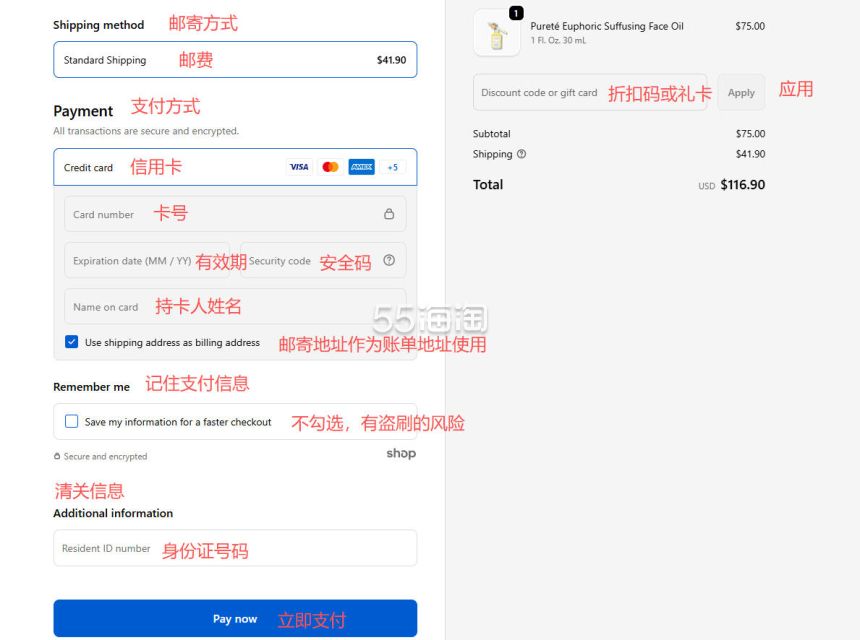 7.地址填好之后会显示邮费,最后填写支付信息,选择信用卡支付的话,根据提示填写好信用卡信息,记住不要勾选保存支付信息的选项,有卡被盗刷的风险。账单地址可勾选和邮寄地址相同,最后点击“Pay now”提交订单完成支付后,订单就生成啦。
