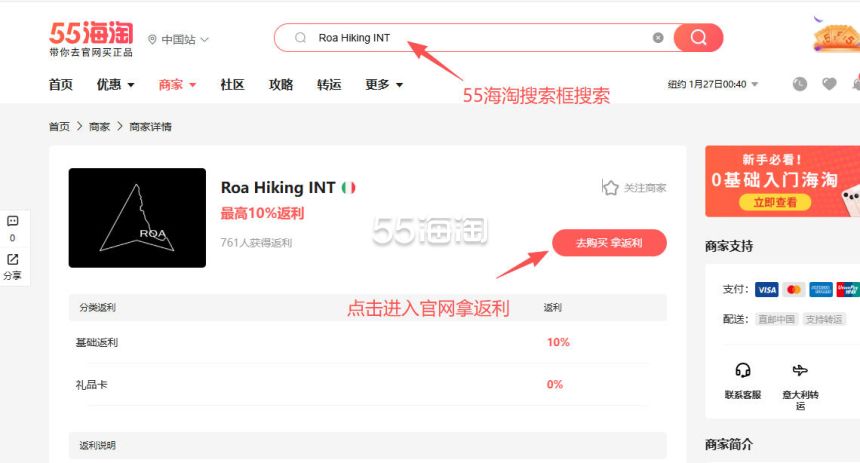 1. 注册并登录55海淘账号,不仅可以关注到国内外购物网站的优惠折扣,购物还能享受返利。本次教程以55海淘网页版为例。首先,在搜索栏搜索Roa Hiking INT,点击“去购买拿返利”进入Roa Hiking 意大利官网。