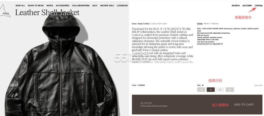 4. 账号注册好之后就可以开始购物啦,选择你想买的产品,进入到详情页,选择好尺码之后,点击“ADD TO CART”将产品加入购物车,可点击页面右上角的购物袋可直接进入购物车。