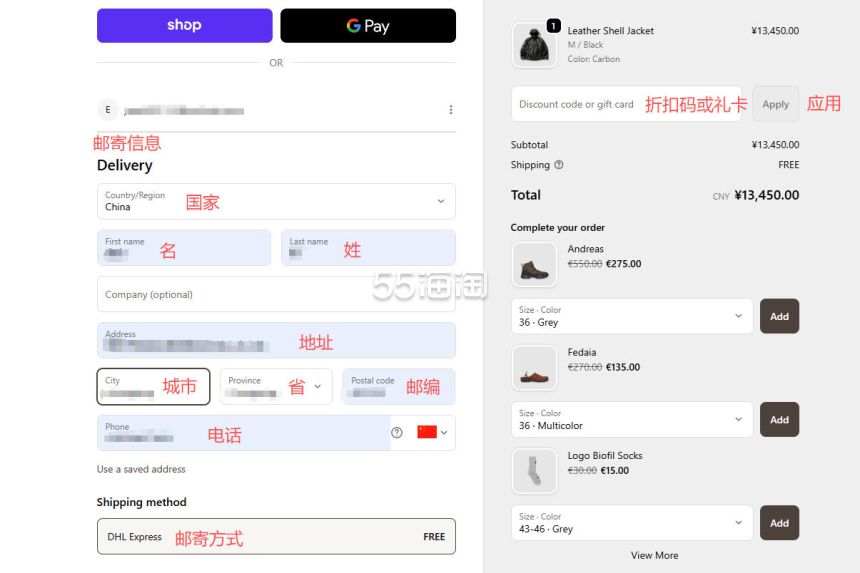 6. 首先来填写邮寄地址,网站支持直邮中国,国家可选择“China”,地址填写中文地址拼音,有折扣码可以添加折扣码使用,邮寄方式默认。