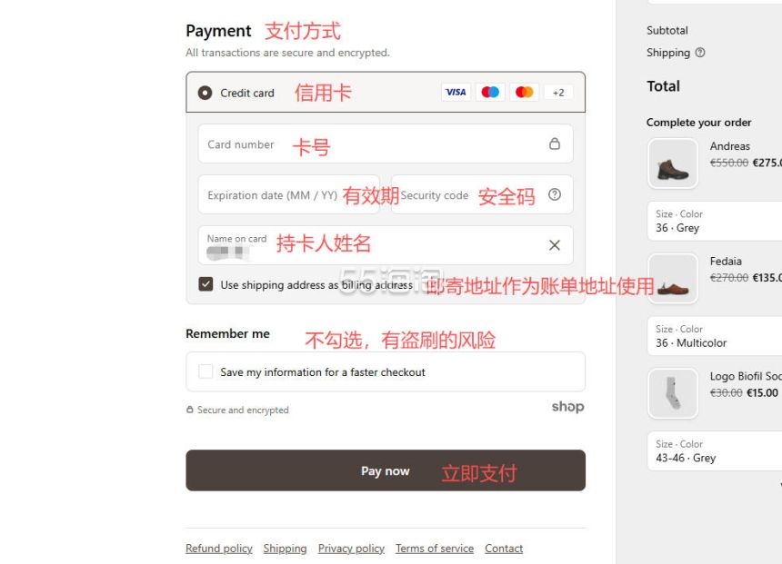 7. 最后填写支付信息,选择信用卡支付的话,根据提示填写好信用卡信息,记住不要勾选“Remember me”保存支付信息的选项,有卡被盗刷的风险。账单地址可勾选和邮寄地址相同,最后点击“Pay now”提交订单完成支付后,订单就生成啦。